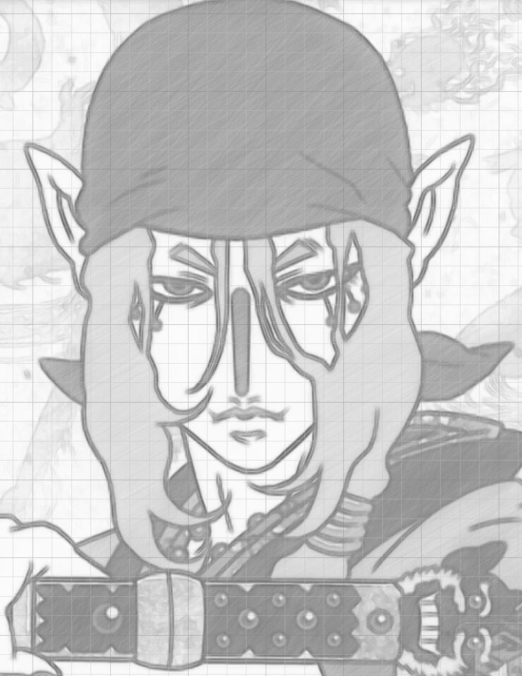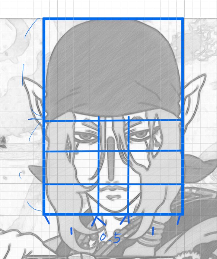 まず、薬売りさんの顔全体の長さと、顔の横幅を長方形をベースにアタリをとる。