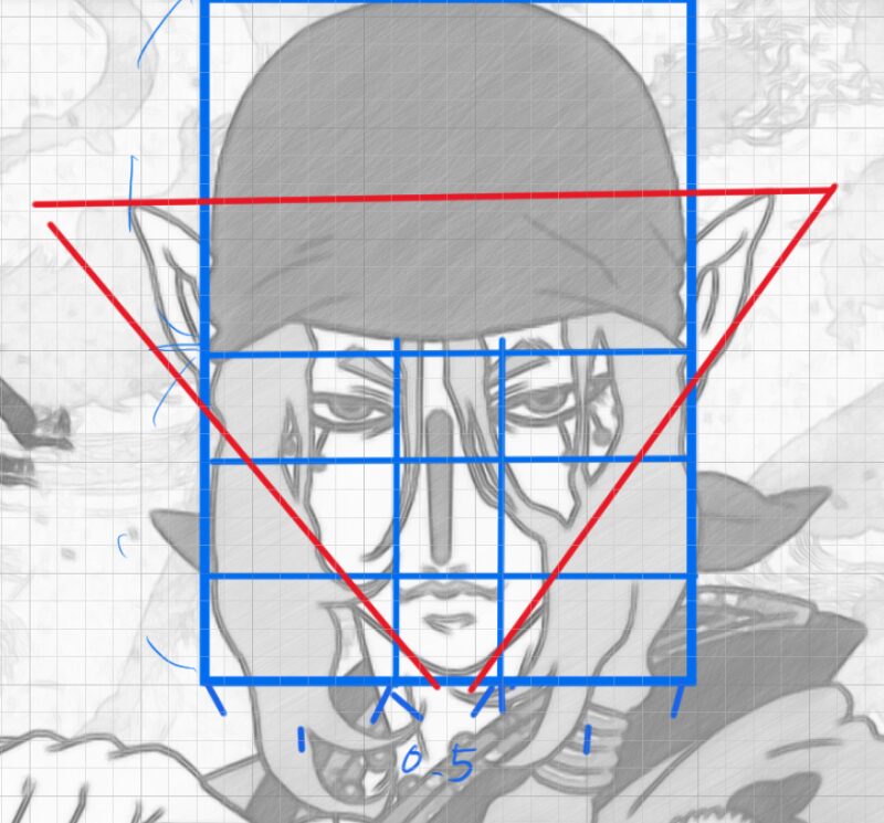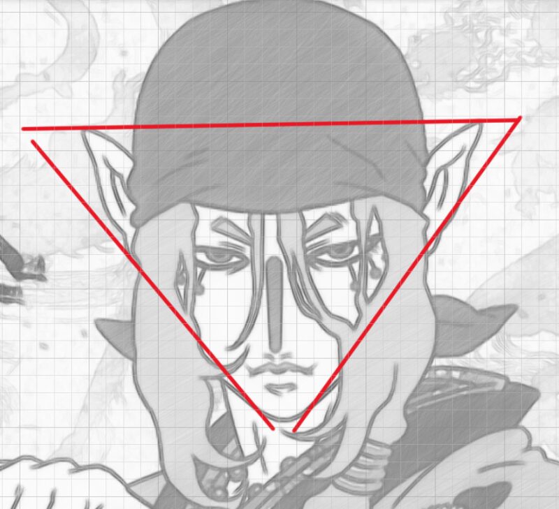 というわけで、薬売りさんを書く時は、長方形と三角形の二つの図形を元にアタリを取ると良さそうだ。